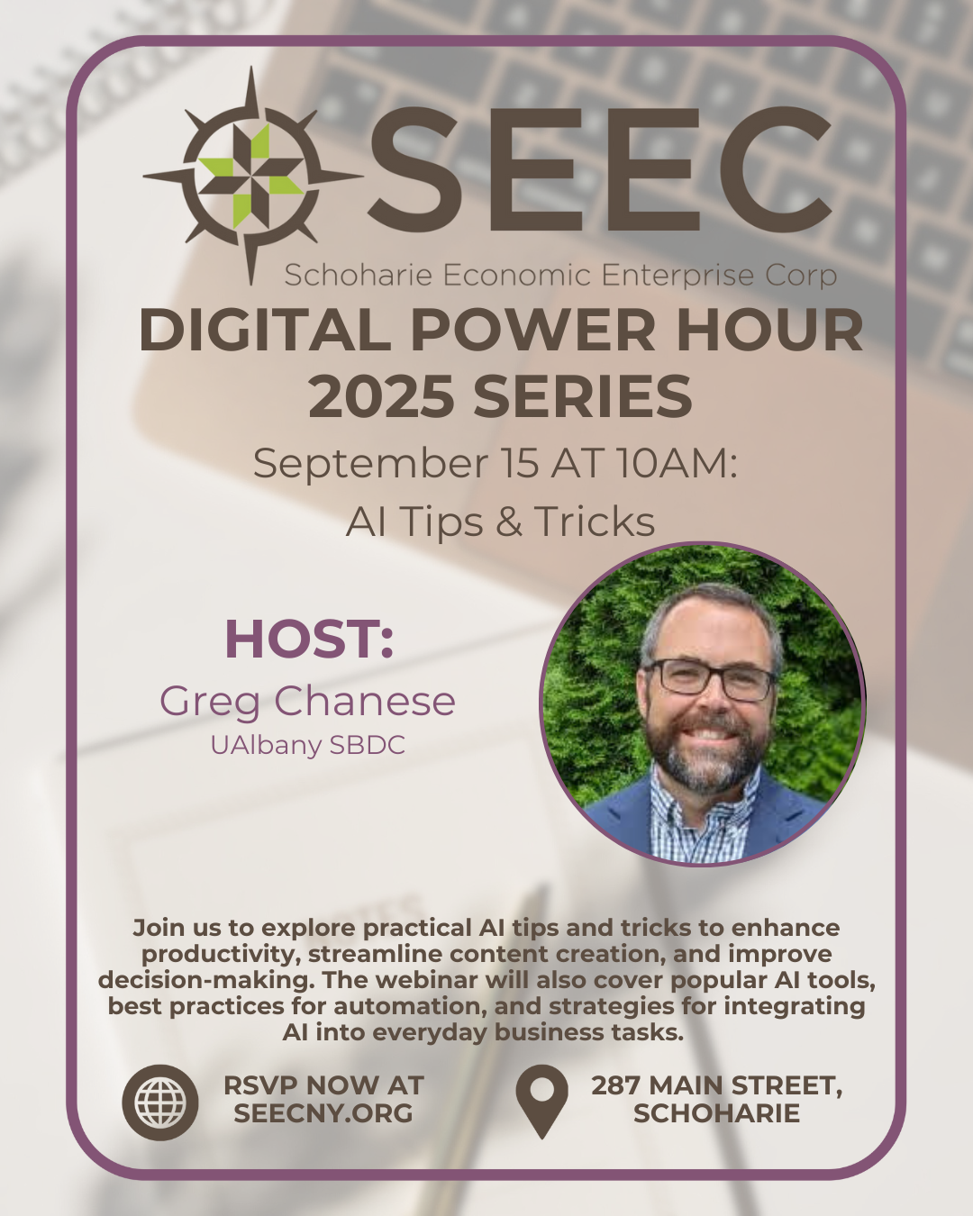Schoharie, NY – September 10, 2025 — Schoharie Economic Enterprise Corporation (SEEC) is excited to announce the final session of its 2025 Digital Power Hour: “AI Tips & Tricks” — a free, interactive workshop taking place on Monday, September 15 at 10:00 a.m. at 287 Main Street, Schoharie, and available virtually via Zoom.